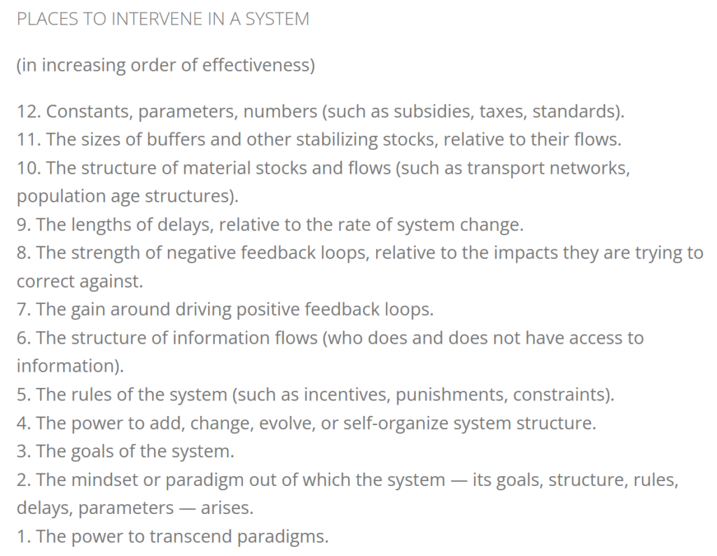 ‘Articulation’ is a powerful driver of systems change. According to Donella Meadows, of all the “leverage points” in a system (Figure 2), the most powerful and effective are those that relate to and transcend the “mindset” or “paradigm” of the system (and its designers). And the weakest are “constants, parameters and numbers” – like the 1.5 degree Celsius Paris target.